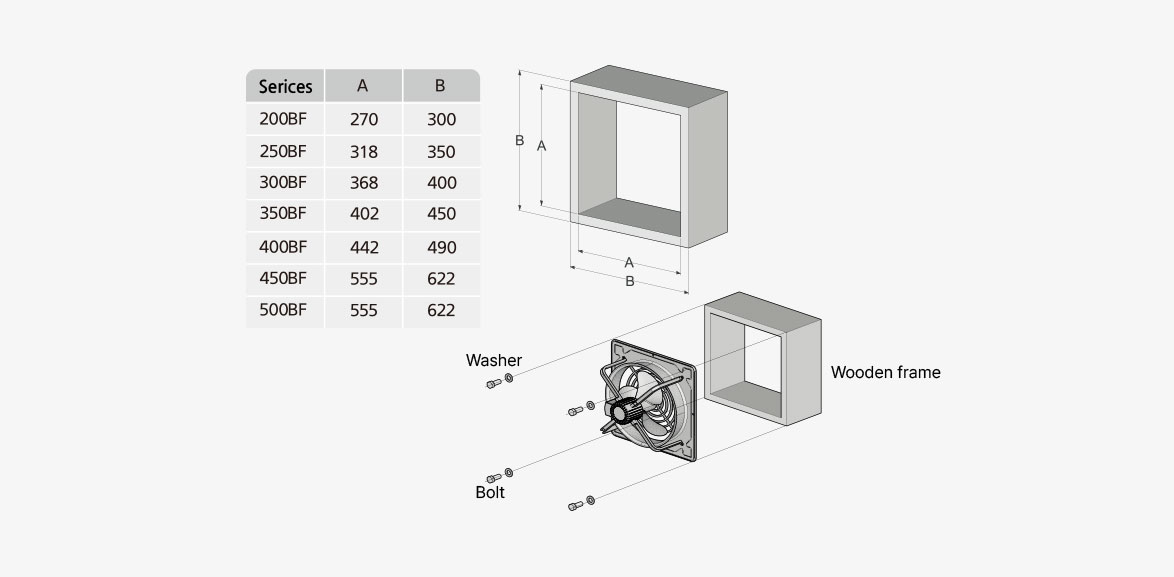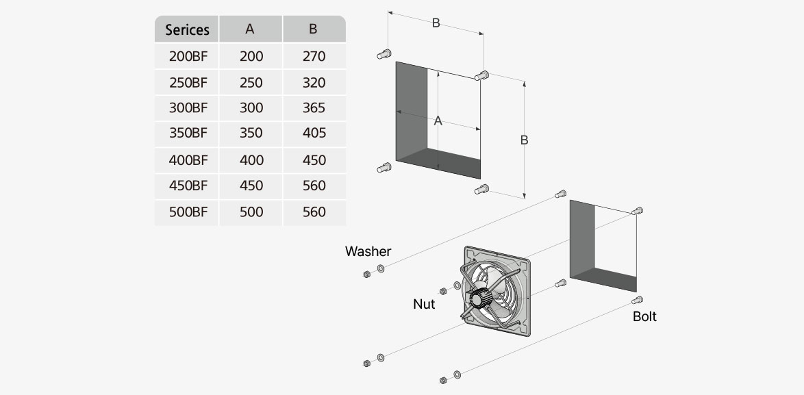 • 2.قم بتركيب الفتحة المخصصة في جسم مروحة التهوية، وتثبيتها بالمسامير، والصواميل، والحلقات.